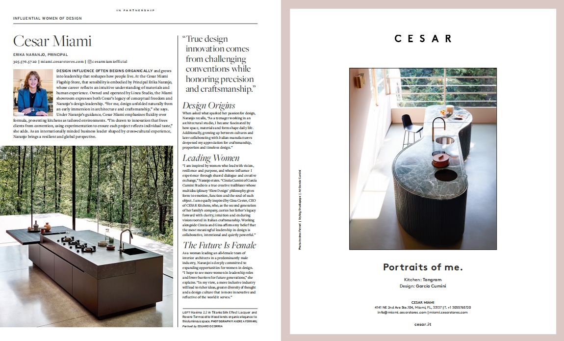 Cesar Miami Principal Erika Naranjo is featured in LUXE Interiors + Design’s Influential Women of Design issue. Naranjo shares how her cross-cultural upbringing and early immersion in architecture shaped her design philosophy — presenting kitchens as tailored environments that reflect individual taste and challenge convention.